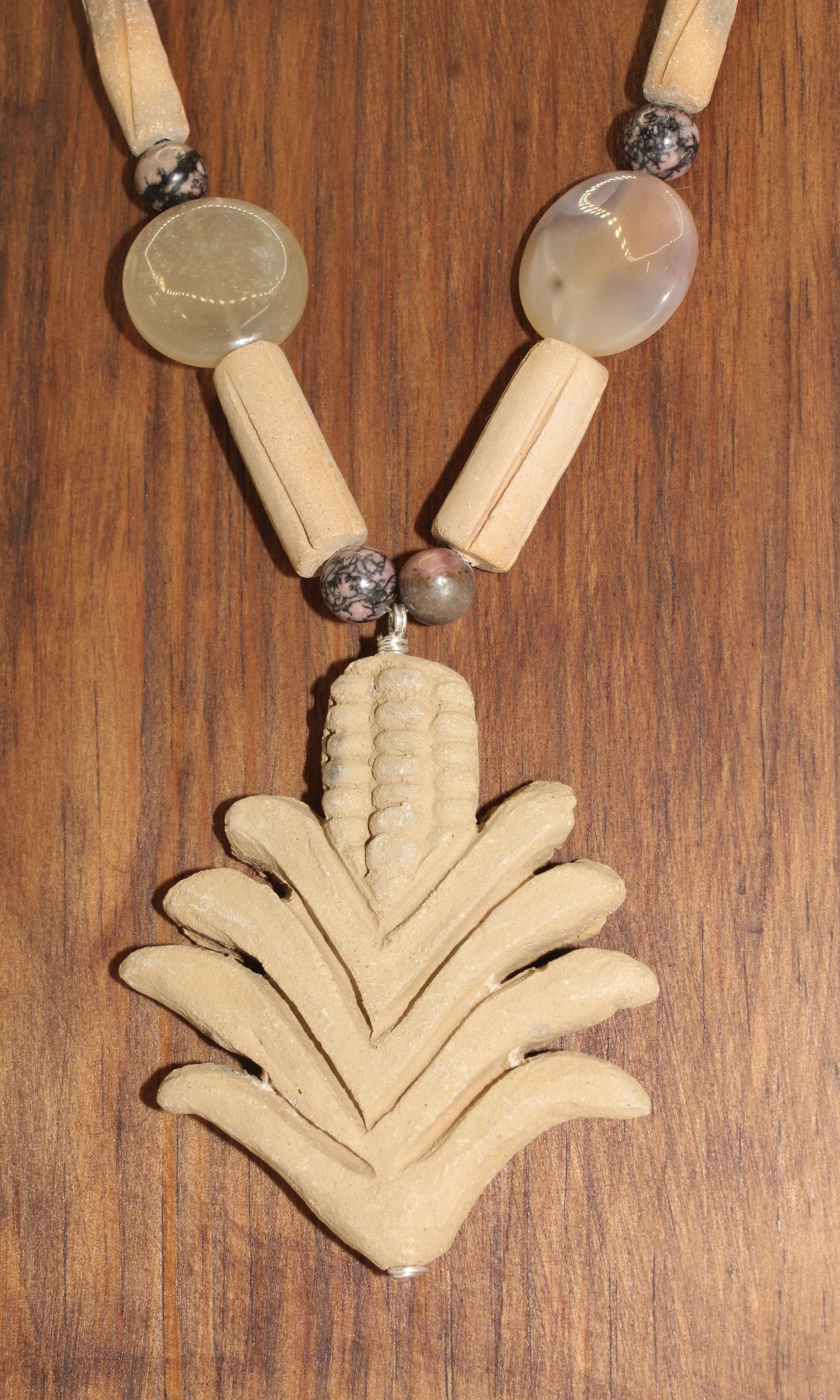 Su elemento central, una mazorca de barro tallada a mano, simboliza el origen, la fertilidad y la conexión profunda con la tierra y las culturas ancestrales de Mesoamérica. Cada cuenta evoca lo esencial y lo sagrado de los ciclos de la vida, creando una pieza cargada de significado y presencia.